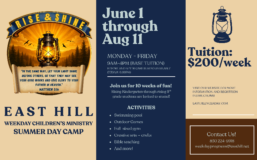 At East Hill we are passionate about providing a fun, caring and safe Christian environment for your children. We will teach your children that God dearly loves them and how they can show that love to others. Our prayer is that every child will one day come to know Christ as their personal Savior and they will grow in their relationship with Him. We also specialize in a wide variety of activities, providing an exciting and rewarding experience for each child. Each student will enjoy many recreational, educational, and entertaining activities all in one place. Every child and family is important to us here, and it is our hope that they may find home with us among our many programs.
